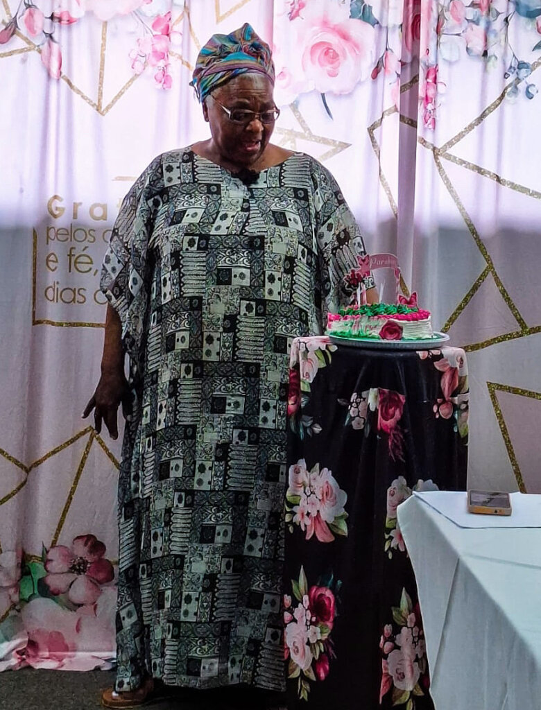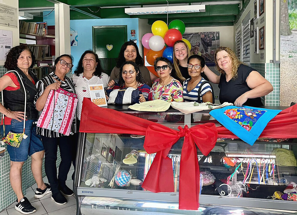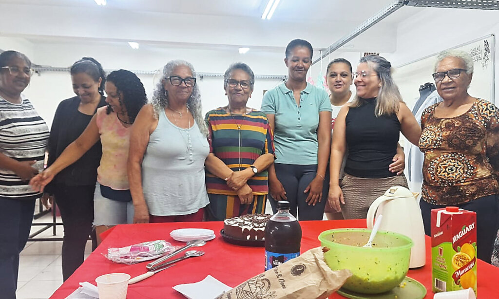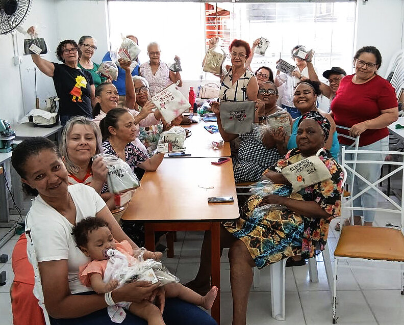 Another highlight came in December when the women gathered at ACER for a social gathering where they received certificates of attendance for the year and Dona Jacira was presented with a birthday cake in celebration of her 77th birthday. Later, they held a smaller, informal end of year celebration in their workspace, exchanging gifts of purses embroidered with ‘Eldorado Têxteis 2025’, and in January they held another social for the five women whose birthdays fell during that month.