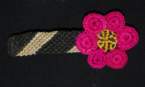 One new model of chambira woven hair barrette made by artisans from Brillo Nuevo. Photos by Campbell Plowden/Center for Amazon Community Ecology. See more photos of hair barrettes and the artisans who made them.