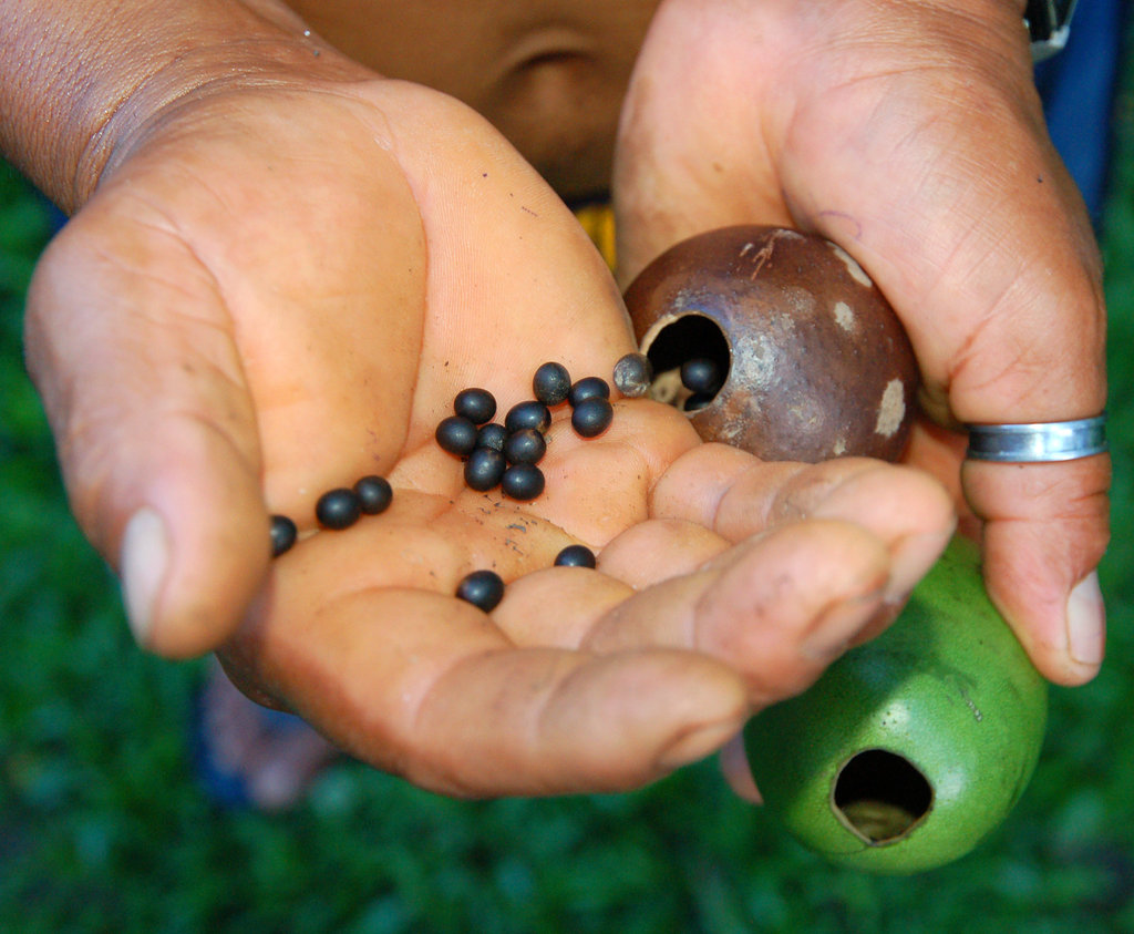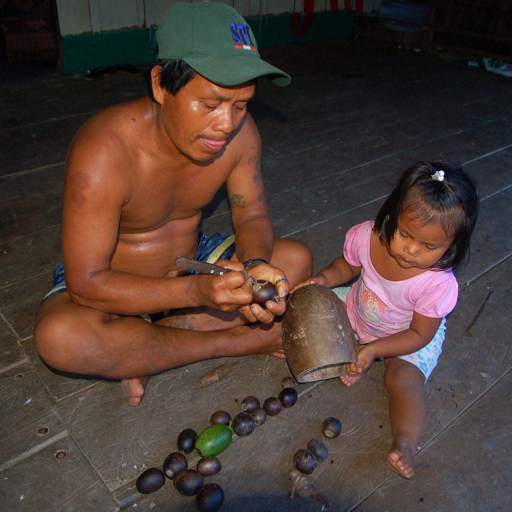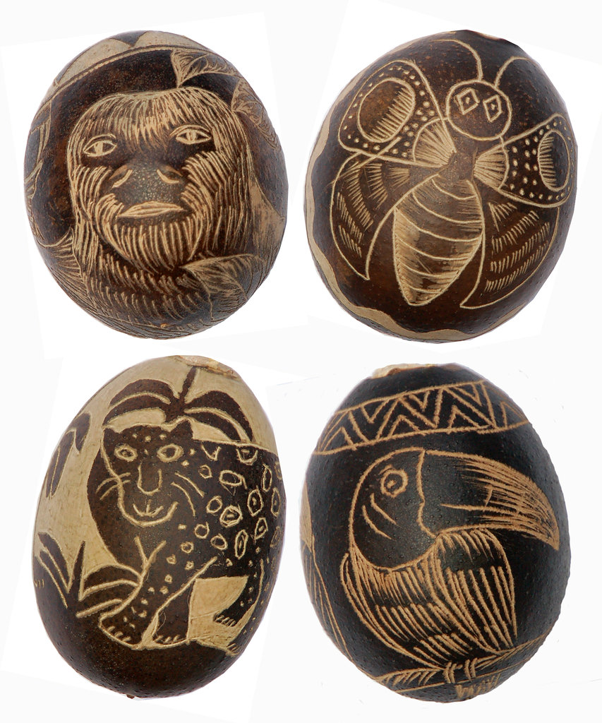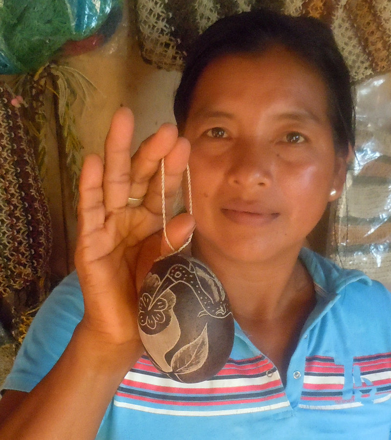 Many artisans like master carver Rider Velasquez from Puca Urquillo Bora plant these trees in their back yard so they have a ready supply of egg to watermelon size pods to make a container or any size bowl they want. This summer, Rider showed me how he cleaned out the pulp from a “wingo” or “tutuma” fruit with a small rounded scoop he crafted from a metal rod and then lays it in the sun to dry. He then sits on his porch, imagines some butterfly, snake, or fanciful gremlin from the forest, and etches the figure free-hand on the dark brown pod with a small awl. If he’s happy with the design, he pours a few dozen shiny black achira seeds into the hole on top and then seals the opening with a plug of balsa wood. After attaching a small chord made of natural chambira fiber, the ornament is ready to hang from a tree or use as a rattle that fits in the palm of your hand. CACE has now bought several hundred ornaments from Rider and other artisans from his village and Brillo Nuevo. This income allows him to avoid cutting down trees for his livelihood. These ornaments featuring diverse Amazon mammals, birds, bugs and frogs will be featured in the fall Gifts for Good promotion on GlobalGiving.