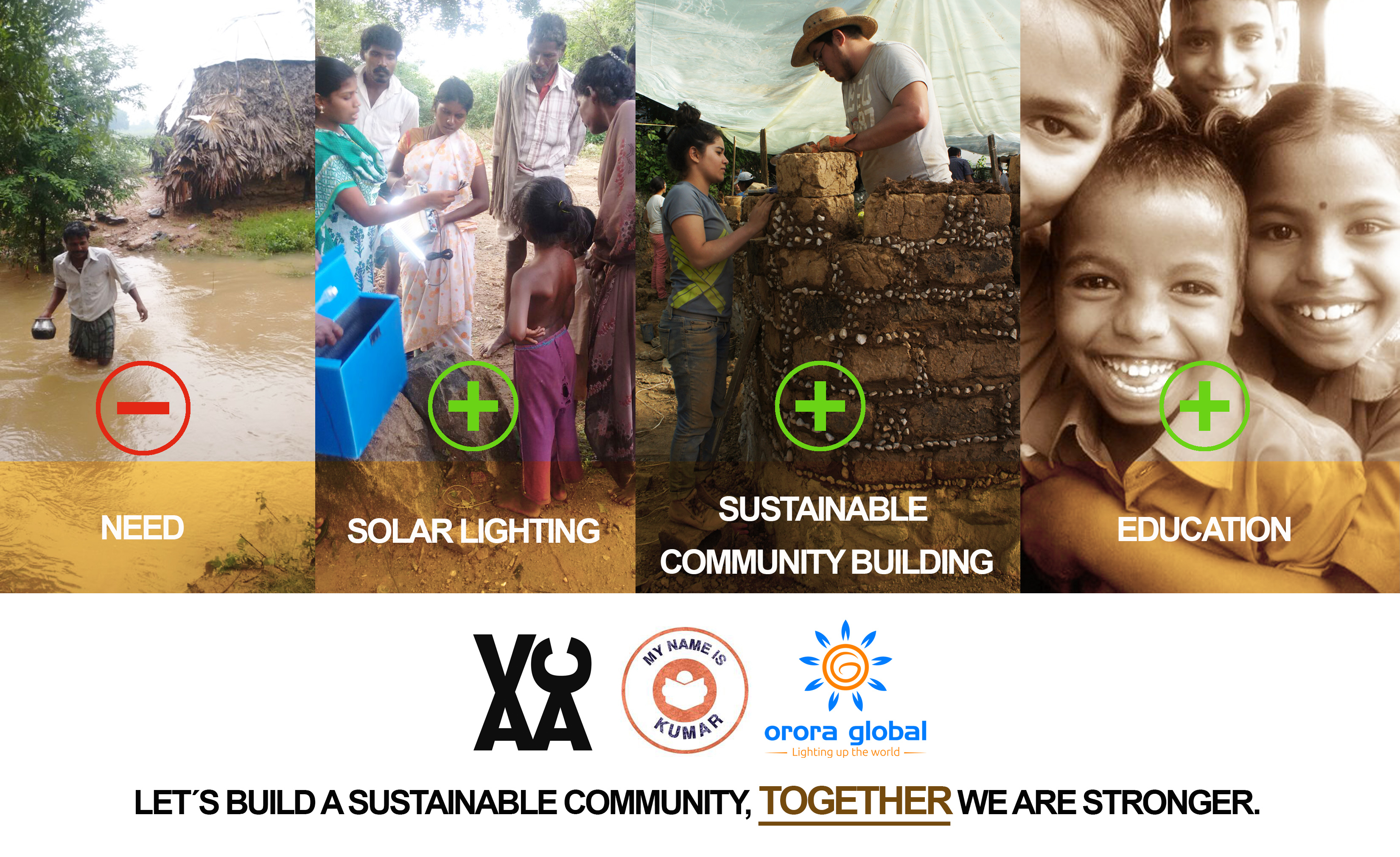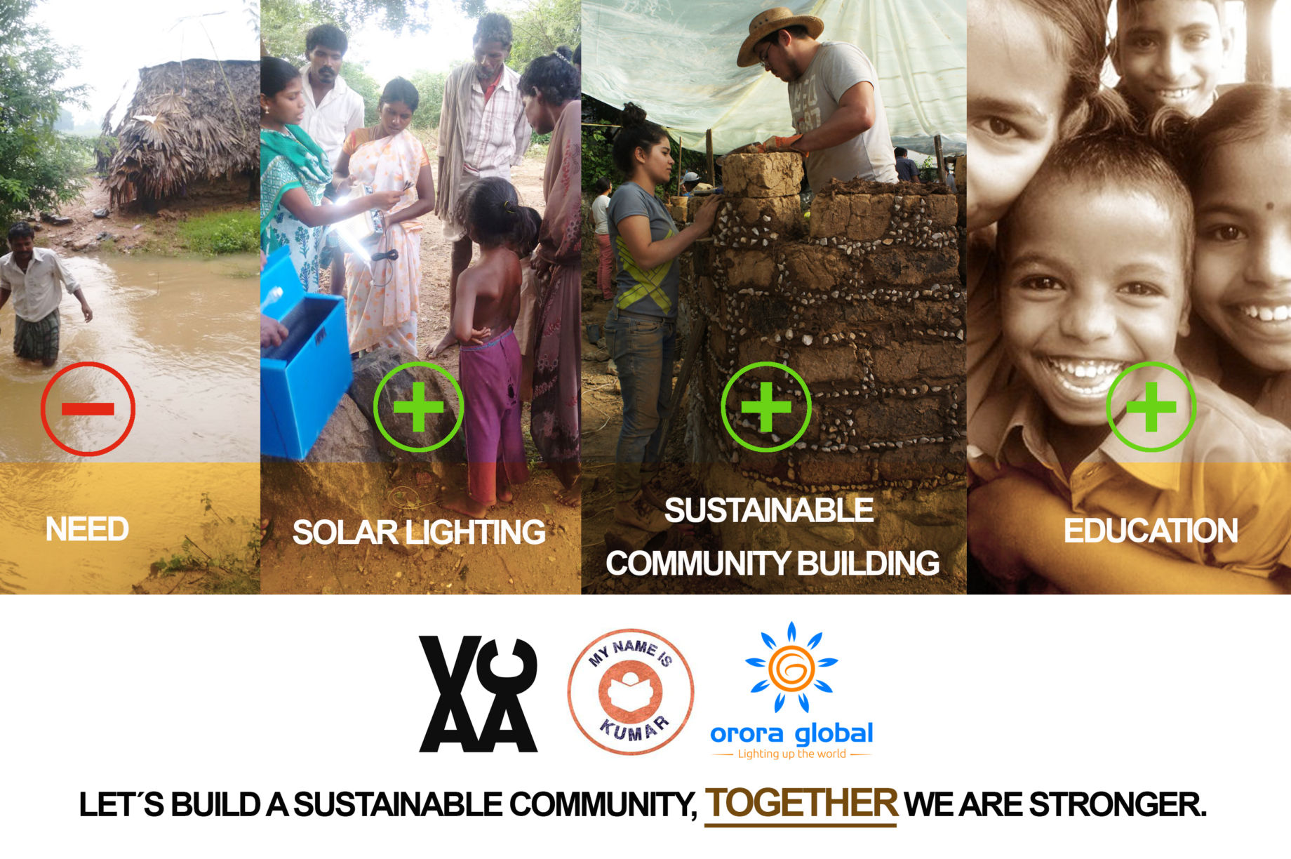 Families can use natural resources to build sustainable, comfortable, beautiful and durable spaces. All of houses are powered using low-cost, solar solutions (Orora Home S-System) which will provide bright LED lighting and cell-phone charging. The communities can learn the skill of building homes and selling solar products which they can provide means for economic livelihood in their local communities, making our model an example of true sustainable development in rural India.