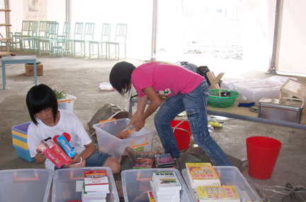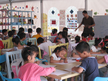 Our giant “Big Top” tents have proved hugely popular with children and the entire community. The BigTops offer preschools, after-school music, art and sports (ping pong, badminton, martial arts, basketball) and other therapeutic activities for school-age children. Most sites have 6 teachers, two caregivers, two supervisors and security guards, and serve between 500 and 1000 children. The centers offer preschool in the mornings, as well as after school activities, including art, dance, sports, English, games, library, etc.