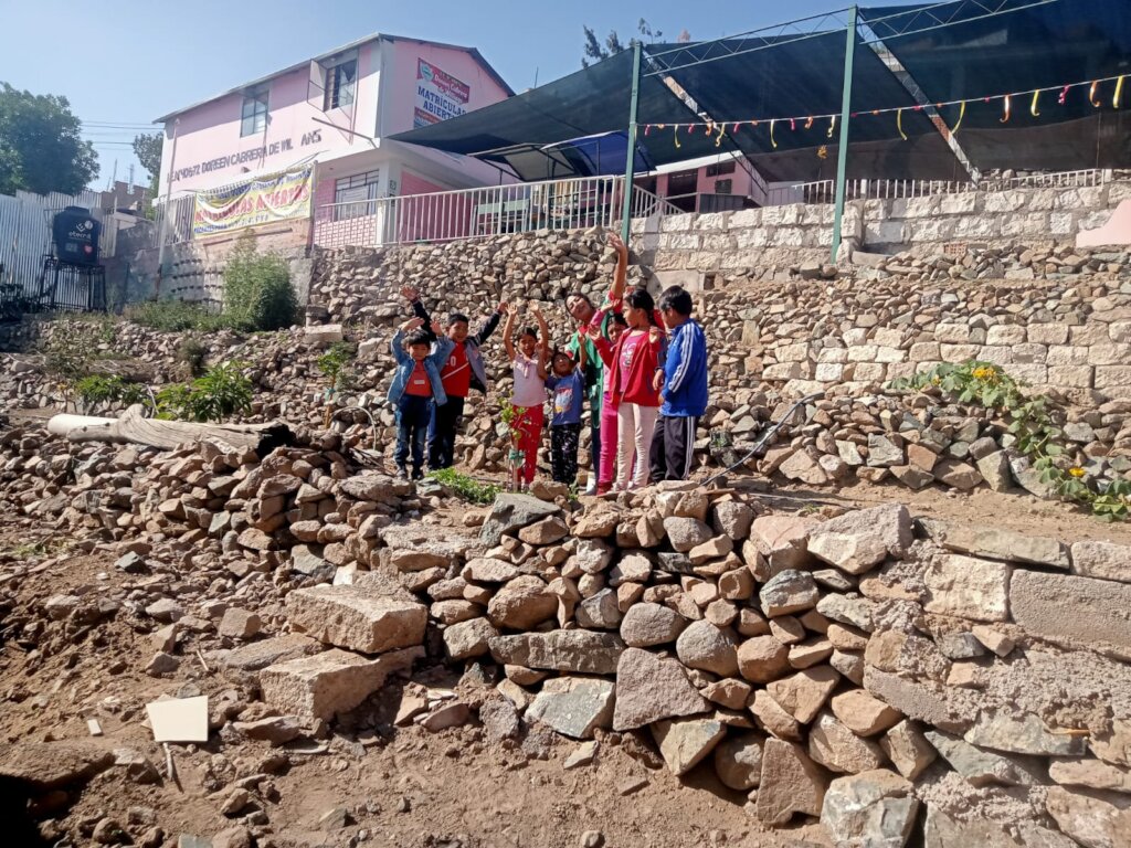 In Peru twenty-eight students and three teachers were involved in this year’s Impington International College, Cambridge, United Kingdom, trip. The final terrace of the vegetable garden was cleared of rocks and levelled out. Drip-irrigation was installed and vegetable seedlings were planted, including onion, beetroot, lettuce and cabbage. The temporary large stone steps between the main school and the classroom which was built on the first Impington trip were replaced (lots of rock which was removed from the vegetable garden went into the concrete mix.)