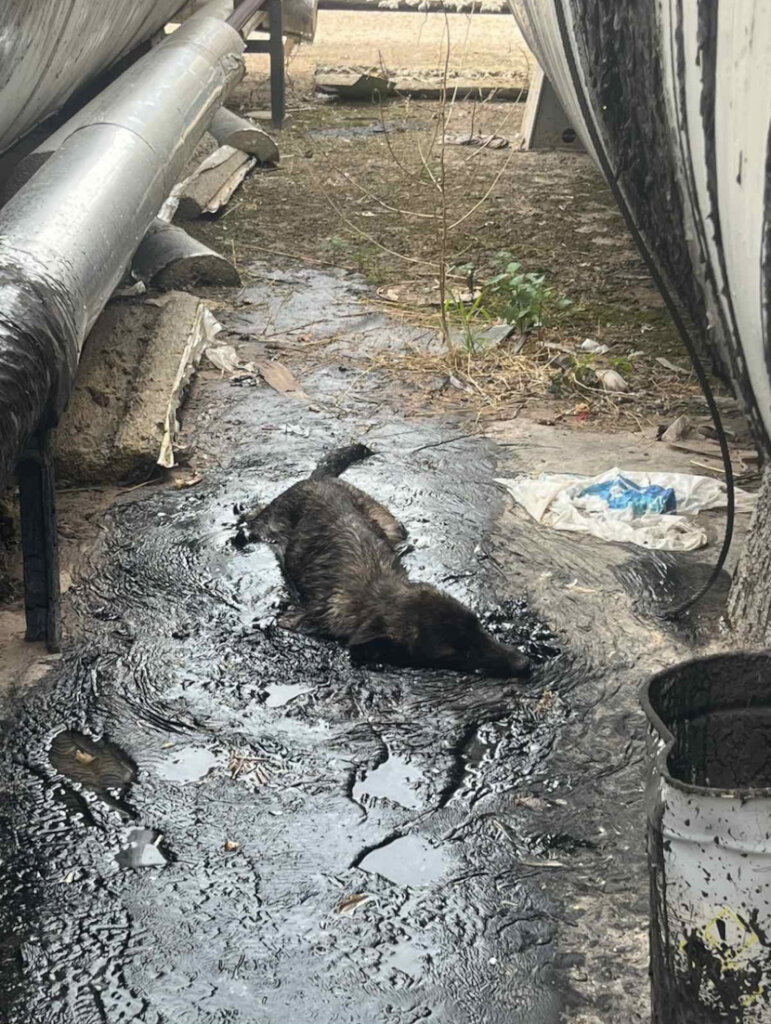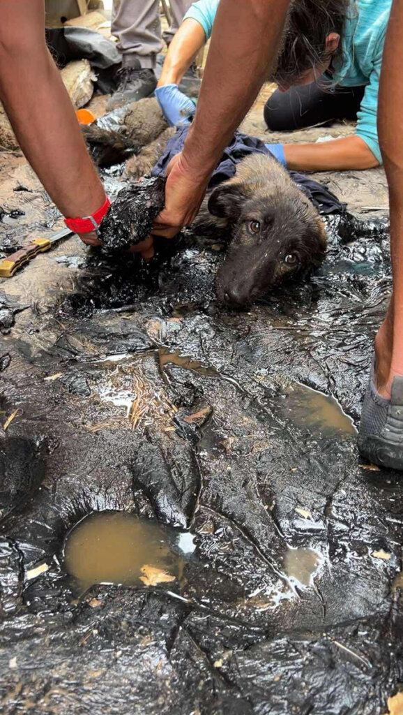 At the beginning of August, the shelter administration received a signal that in a nearby asphalt base there was a dog, stuck in a puddle of hardened bitumen mixture. When the shelter staff arrived at the location, they found the dog lying down motionless, with body and jaw fully stuck in the bitumen puddle. The dog was crying and it was obviously that it was in a lot of pain. It took a whole hour for the volunteers on site to cut off a section of the hardened puddle, together with the dog stuck in it, by using shovels and scissors.