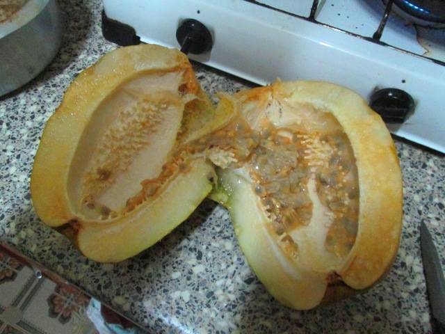 We kept the seeds and propogated them. Our first vines were grown at the farm as a trial to see how they would work. The vines grow thicker than standard passion fruit vines, but to hold fruit that can easily weigh 7 pound thaat is understandable. After about 16 months our first fruit were started to ripen. We invited villagers passing by the farm over to try them and they were both suprised and excited as most had never seen them before. We cut the melon portion into slices and it is so soft and juicy that with the first bite the juice started dripping off our elbows.