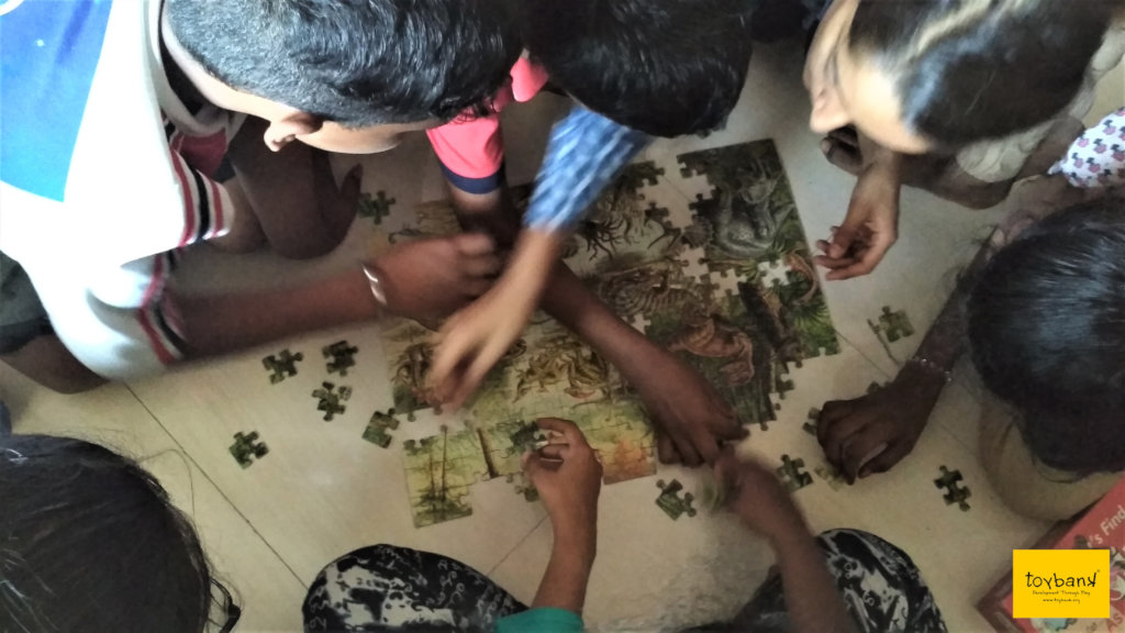 As the game progressed, they searched for puzzle pieces with their respective dinosaur’s color and patterns. Gradually, as their dinosaurs took form, the pile in the center grew smaller. Whenever they would find someone else's dinosaur piece they would give it to the other person. They were so engrossed in playing, they unknowingly started to help each other. They started talking about their dinosaurs, which part is missing and whether the other person had seen the missing puzzle piece.