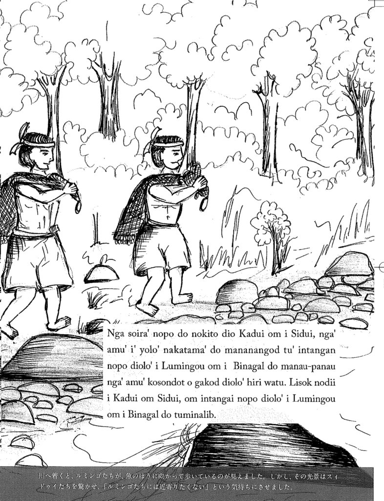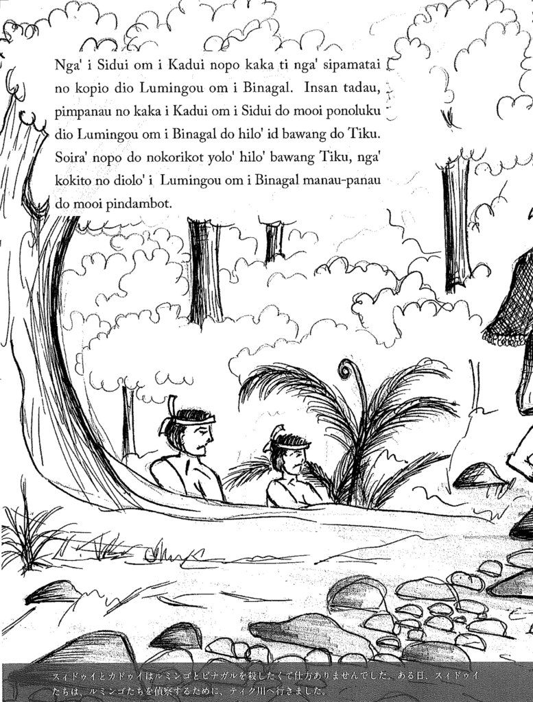 In this report on these oral histories and legends, we share a short story with you, and the contemporary context for the feats it recounts, and how it reached you. The story features two folk heros of mutiple tall tales, Kadui and Sidui. Kadui, we learn in another story included in the book, was so strong, he once jumped the river in a single bound, carrying his wife on his back. In this tale recounted by Angeline in an interview with community researcher Jiloris, for once Kadui and his brother find themselves outmatched.