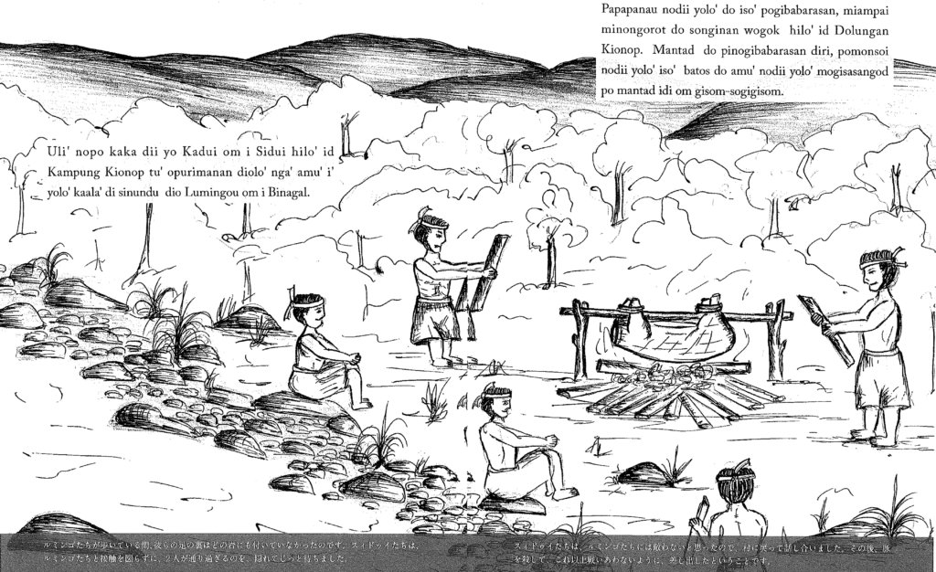 The illustrated set of Ulu Papar oral histories and tales collected by Dusun community researchers is nearing completion—the illustrations in this report, by Imelda, are taken from the first proof of the volume, complied and translated by Shinobu at Gakushin University with support from GDF staff and the Kazadusun Language Foundation. The Dusun text is shown here, interspersed with Imelda's illustrations. Your support will enable it to be printed and distributed.