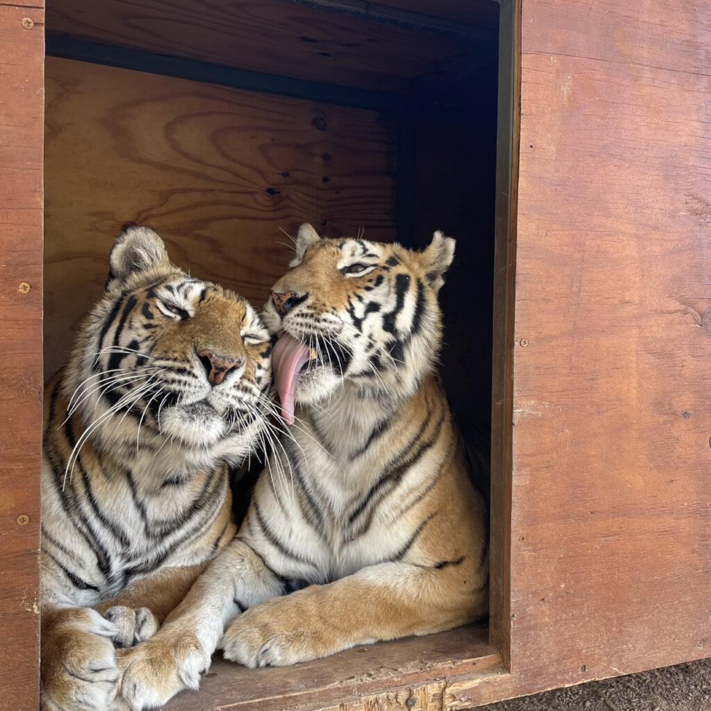 Tiger sisters Juanita, Eva, and Natasha have also settled in very well. Juanita and Eva share a habitat and can often be found snuggling together- such a joy to watch! Natasha took a little longer to feel comfortable but now she is thriving in her new environment. All three girls love to lounge in their hammocks and prowl their territories. Eva is the most vocal and affectionate- she is always happy to see her caretakers and gives a cheerful chuff of greetings!