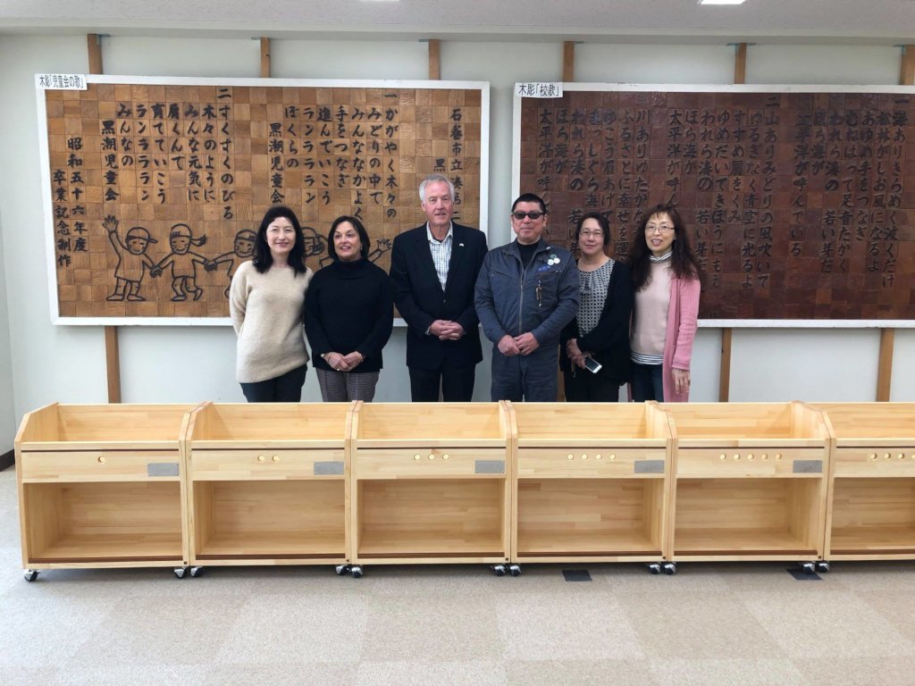 We dedicated the 14th Taylor Bunko to Minato Elementary School in Ishinomaki and were treated to a beautiful ceremony and song from the children. We presented book coupons to the students so their school can fill the shelves with books of their choice. Endo-san made six different rolling bookshelves so each grade has their own. He bore a hole per grade in the American pine so each class knows their bookshelf. He said he used sequoia, the tallest tree, that reaches to Taylor in the sky for a horizontal piece that connects each grade and a hard wood, Indonesian Ulin for the bottom book retaining strip so it would withstand the wear of student use. We told the children we hope the books will help them to find their dreams as Taylor did.