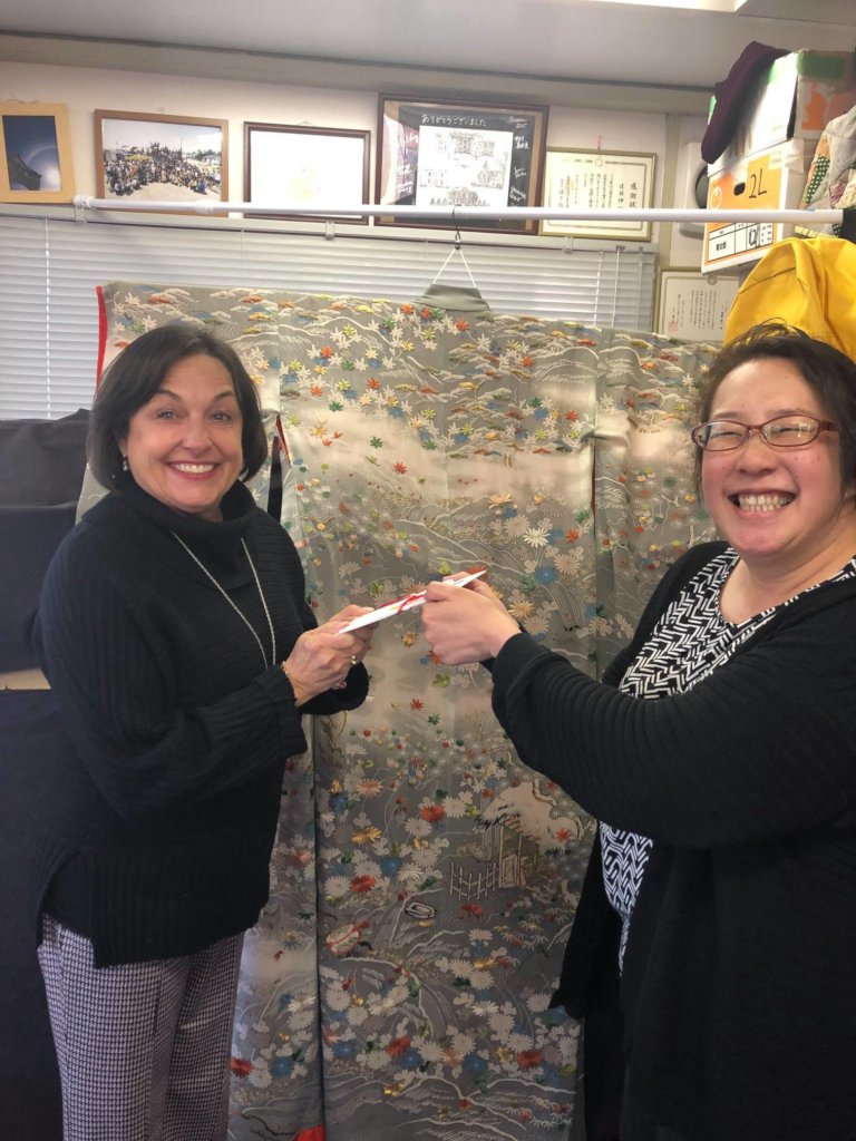 Ryoko presents Jean with a donation to TAMF from the profits of Ishinomakimono card sales. The kimono in the background was just donated. It is a 120 year old wedding kimono and will make for beautiful cards. You can contact Ryoko about the cards at Ishinomakimono@gmail.com!