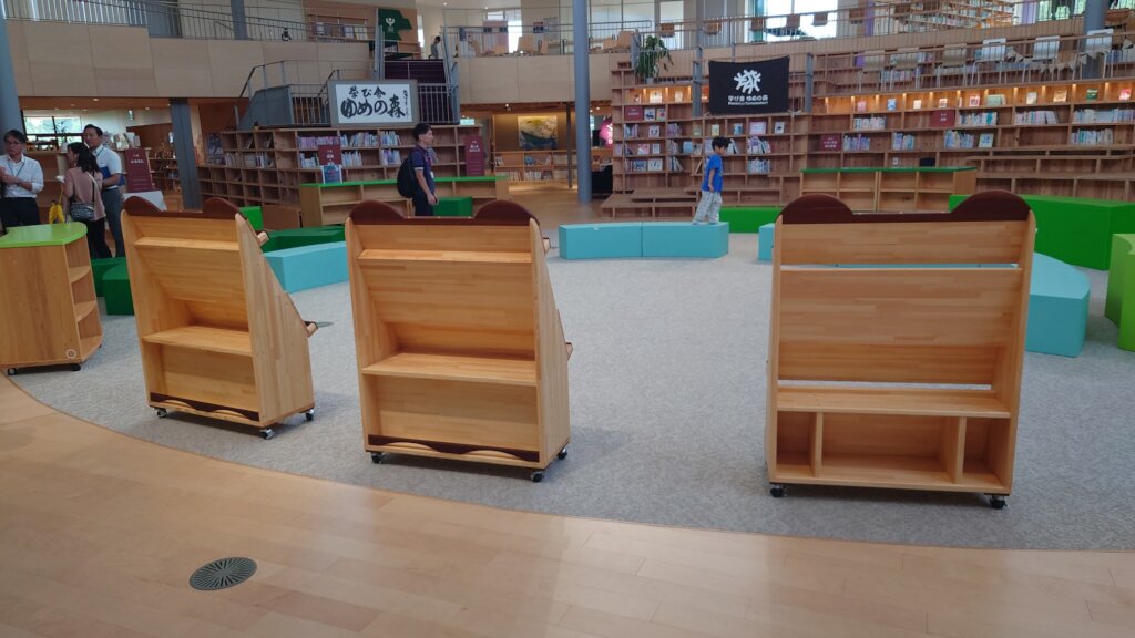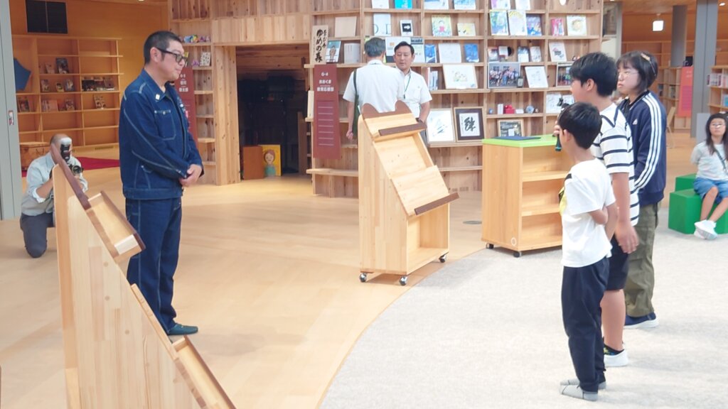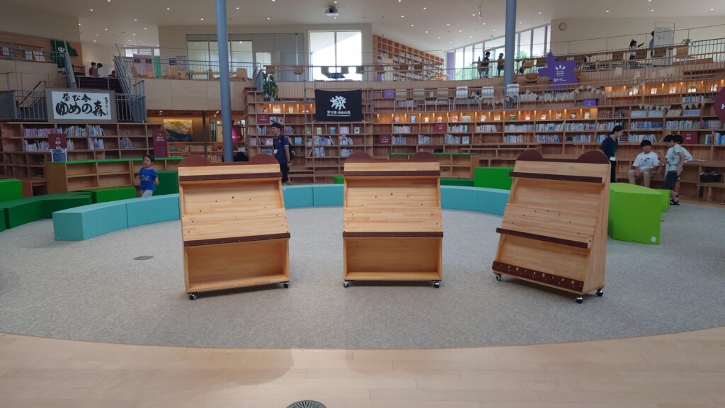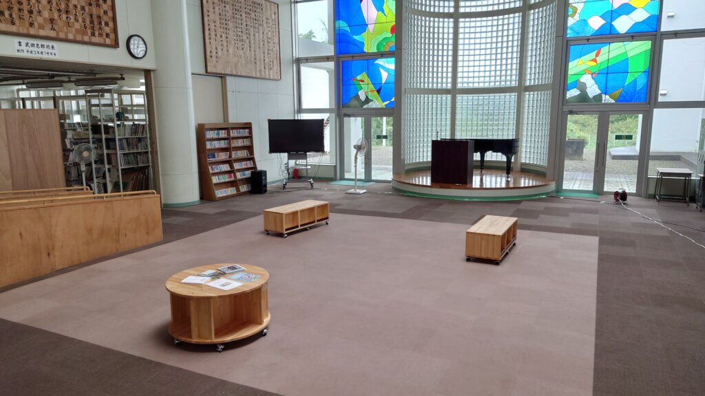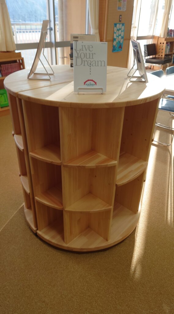 The bench like bookshelves are made of redwood rods arranged in a rainbow-like arch shape. The principal plans to use the book coupons to purchase several textbooks from different Ishinomaki High Schools so the students can use them as a reference when choosing which High School to attend.