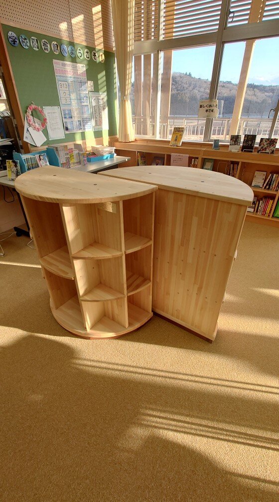 There are three donated wooden bookshelves, two of which are named after towns, with bear ears shaped. The kanji for Okuma town means "big" and "bear" so Endo-san made bear ears for the bookshelves made out of Ulin, a hardwood, since the kids will probably want to play with them! Endo-san is always so creative. It was also Endo's idea to use the flip side too. It also fits in will to a school with lots of trees, and the kids will be happy.