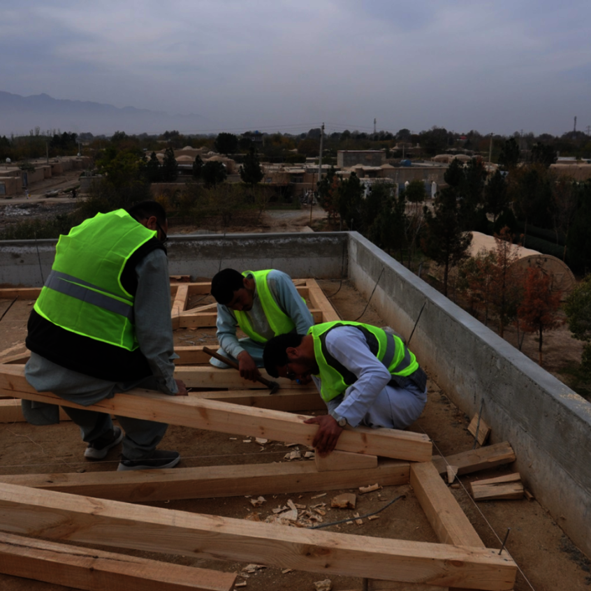 The construction work is making great progress: The metal railings in the corridors and on the interior and exterior stairs of the main building have been made and installed. Tiles were laid in the toilets and the hand-washing facility with the associated sanitary system was installed.