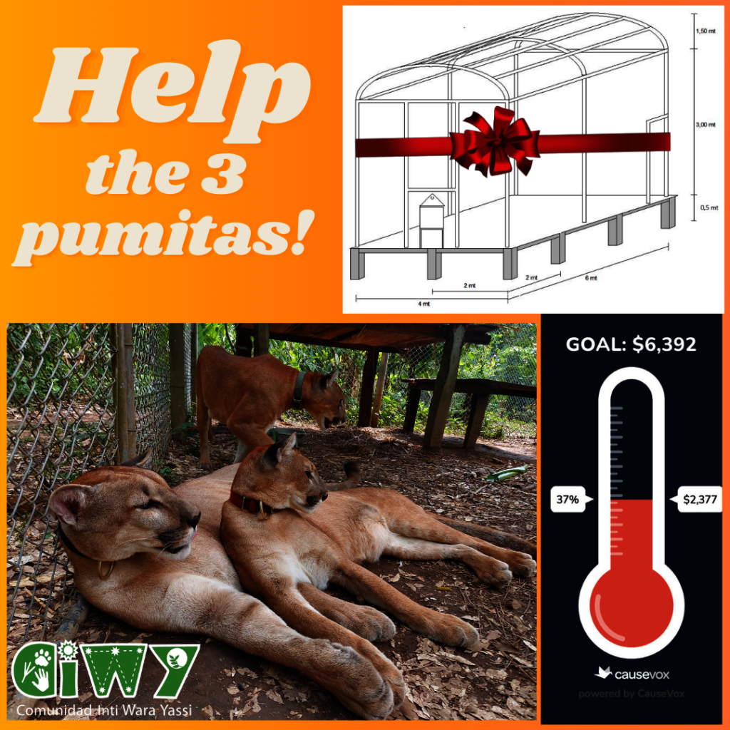Los felinos rescatados del tráfico son especialmente difíciles de liberar: después de una vida en cautiverio, un puma o un jaguar buscaría a los humanos para conseguir comida, lo que provocaría que muriesen de hambre o de un disparo. Por lo tanto, CIWY brinda un santuario de por vida a la mayoría de felinos que recibimos, brindándoles una segunda oportunidad de vivir en la naturaleza: un gran recinto al aire libre en la selva con comida y enriquecimiento apropiados, así como caminatas diarias por la selva dependiendo del comportamiento individual del animal y la cantidad de voluntarios disponibles.