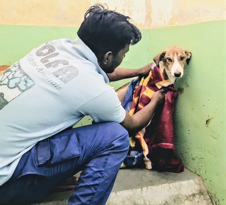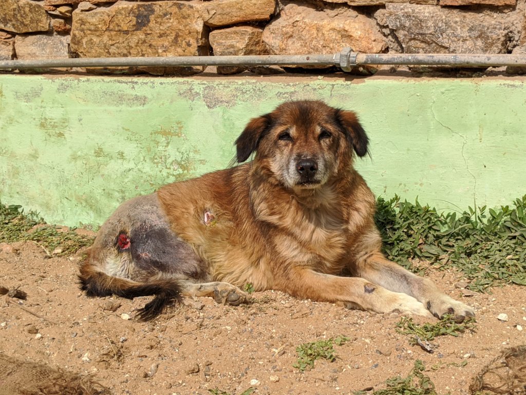 This older male dog was brought into the hospital after being hit by a car in Ajmer. He is spending time in our ‘L’ kennels which are for dogs that need that bit of extra special care. His badly injured back leg has been amputated and he’s getting used to life as a ‘three-wheeler’. Today he is just enjoying spending some time in the warm sunshine (it gets very cold at night during the winter here).