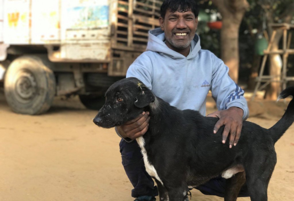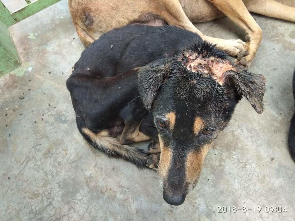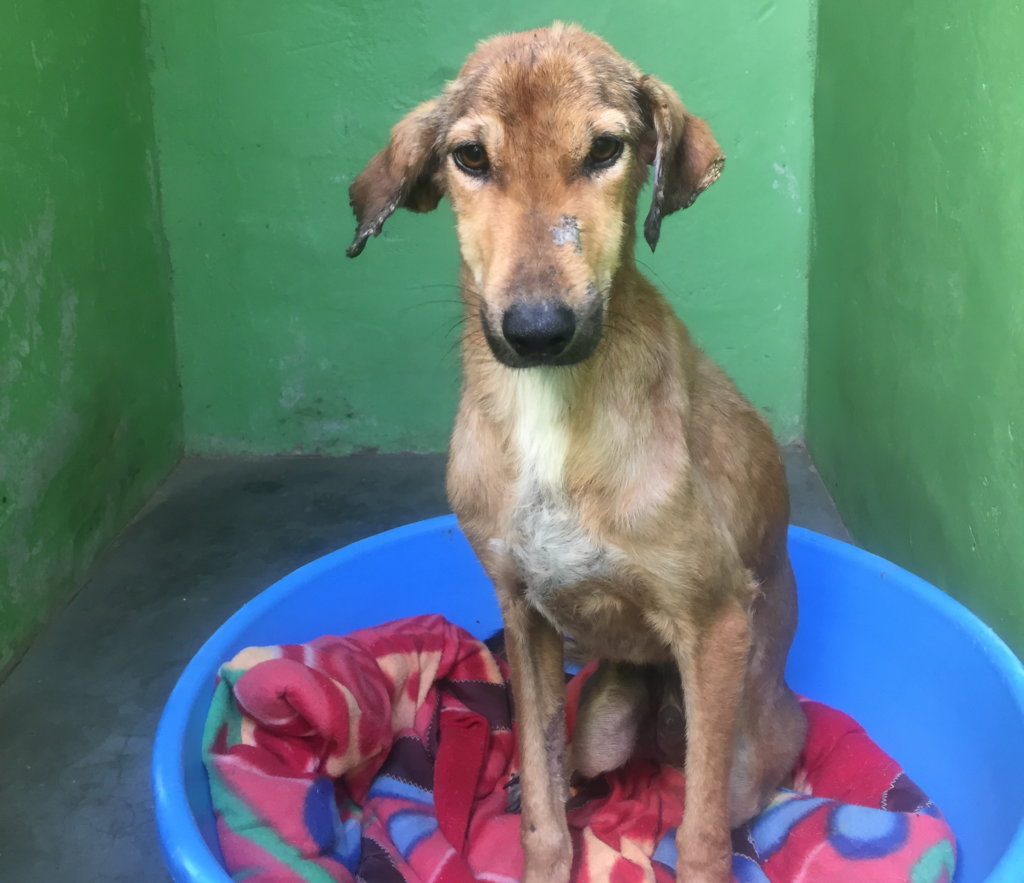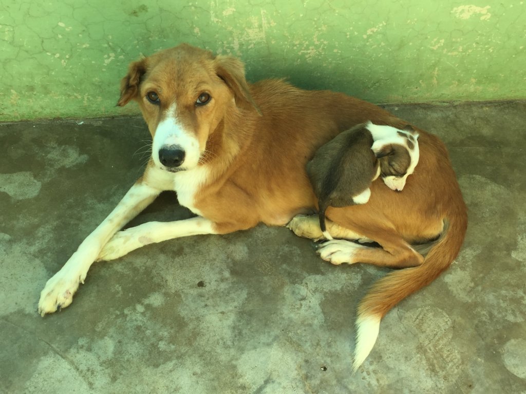 Sweet girl Stella was rescued in the middle of the night with the most terrible head wound. Nearly the whole of her head was swollen with the maggots that were buried inside. Despite the pain she must have been in, she was still happy to greet people with a wagging tail. The wound was probably caused by an over-zealous mate during the breeding season and subsequently became infected and then infested with maggots. After all the maggots were removed and the wound thoroughly cleaned Stella was given pain relief and antibiotics. After only three weeks she was ready for sterilization and rabies vaccination and after six weeks she was ready to go home. In the photo she is just before release with TOLFA staff member Golu. Being sterilised means that she will no longer be hounded by an ardent male dog and therefore unlikely to get involved in any further fighting.