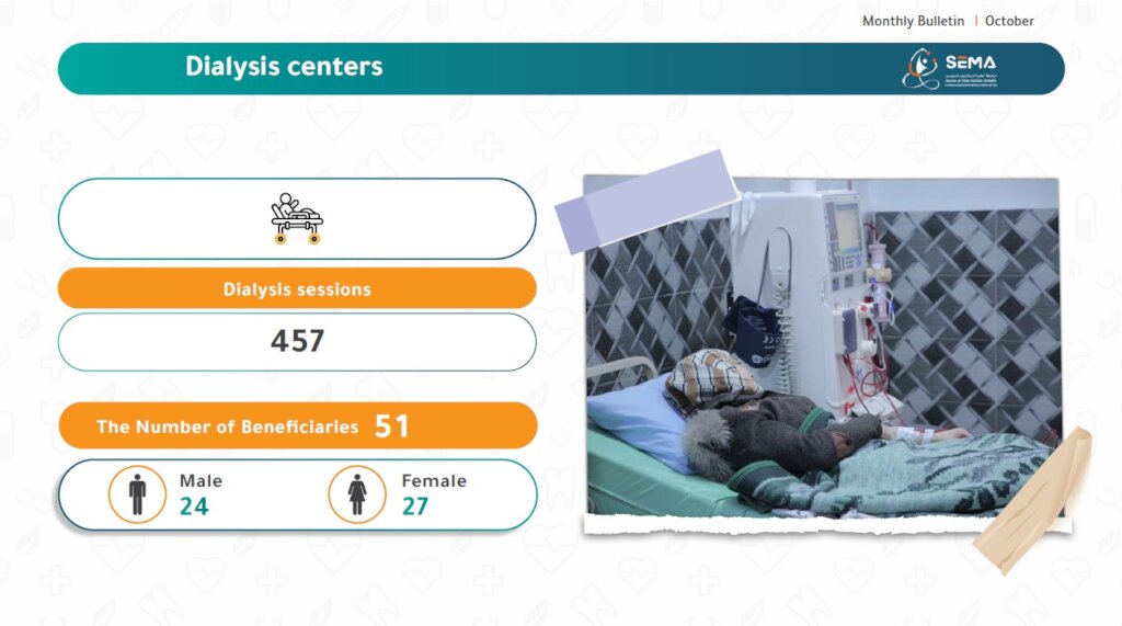 The Kafrtakharim Dialysis Center in rural Idlib continues to provide regular, life-saving dialysis sessions for patients suffering from kidney failure, with sustained support from SEMA over the years. This vital service is not optional—it is the difference between life and death.